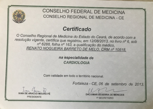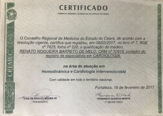 Cardiologista, especializado em Hemodinâmica e Cardiologia Intervencionista. O meu número de registro profissional CRM: 10.818, RQE Cardiologia: 6288 e RQE Hemodinâmica e Cardiologia Intervencionista: 7825.