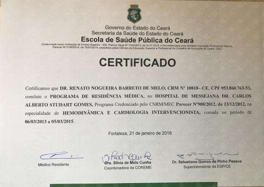 - Especialista com Residência Médica em Hemodinâmica e Cardiologia Intervencionista, Hospital de Messejana (Dr. Carlos Alberto Studart Gomes), 2015