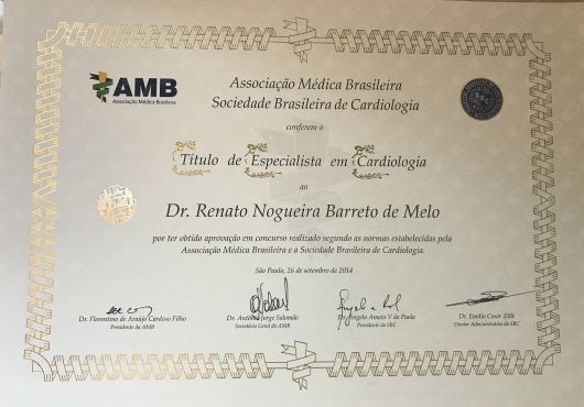 - Titulo de Especialista em Cardiologia, Sociedade Brasileira de Cardiologia - SBC / Associação Médica Brasileira - AMB, 2014