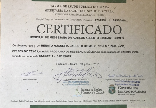 - Especialista com Residência Médica em Cardiologia, Hospital de Messejana (Dr. Carlos Alberto Studart Gomes), 2013